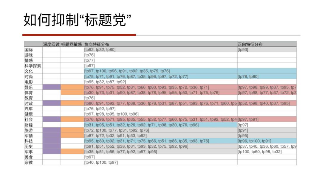 tp开头的编号,就是我们对应的动态特征的区间,数据都脱敏了,可以看到第二列深度阅读,用户在时政、娱乐,或者说旅游,在深度阅读上是有非常明显的倾向的,并且用户在这些类型的内容下对标题党有非常强的敏感度,也就是说用户对这些标题党内容有低完成比与高跳出率,根据我们实际对这个用户的了解、根据浏览历史去匹配发现,这样的特征构建是符合用户的特征。所以我们将这个特征体系加入到精排模型以及重排模型,是有效的抑制用户对分类下的标题党的情况,从而优化用户整个阅读的体验。在实际的ABTest上,我们加入这些特征,对于用户的留存和体验是有一个比较明显的提升的。