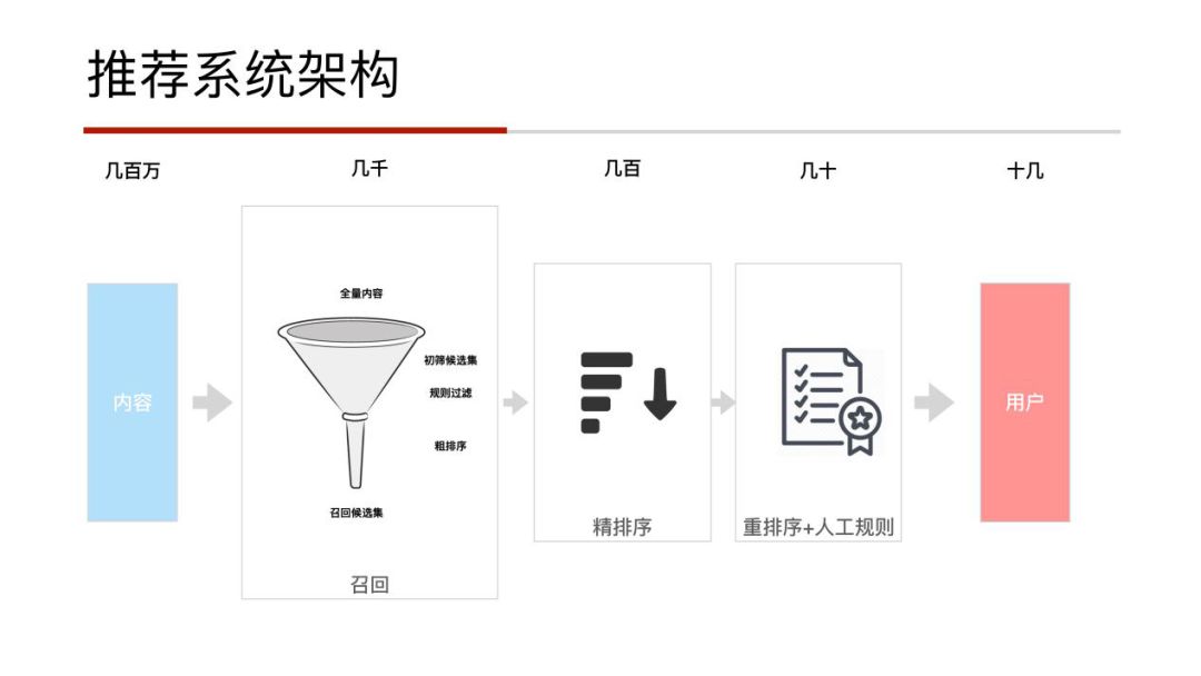 整体架构跟业内是相似的,也是基于召回和排序的框架。左边的内容池是百万的量级,经过召回部分的初筛,规则过滤,粗排序后,可以得到size在几千量级的召回候选集;在精排阶段,经过多目标排序的优化,可以将集合降到几百的量级;最后经过重排和人工规则的过滤,将数据集合可以降到几十的数量集,推送给用户。