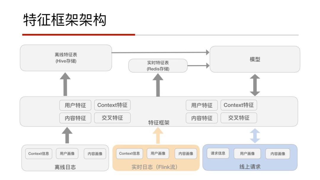 因为以前有许多同学在特征工程这块做过分享,所以这里会说的简单一些。先来说说特征框架。自底向上,主要是三条pipeline的流向,左面的离线日志,中间的实时日志,已经做到了秒级的采集,以及最右边的线上请求数据。中间层特征框架是我们共同抽象出来的共有特征组件,包括线上的请求、实时的处理以及离线的数据,保证了特征的一致性,就是说离线的模型训练与线上的模型预估用的是同样的特征数据,这是非常重要的,如果你在这个部分有偏差的话,就会出现一些特征穿越现象,这也是在早期的推荐系统中非常容易被忽视的一个点。最后是数据的存储,离线日志会存到Hive中,而实时的数据则会存到Redis集群。当线上请求过来的时候,通过特征框架的规范化,去请求模型,最后通过模型得到排序的结果,这就是整个特征框架的一个大致流程。