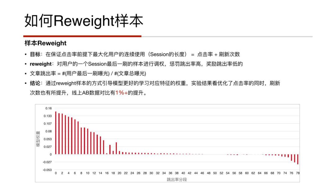 比如在定义任务目标时,我们除了想优化用户的点击率,还想让用户有更高的刷新次数。所以,rewight定义了一个用户的跳出率,即文章的跳出率=用户最后一刷的曝光除以文章的总曝光。将文章跳出率乘在原始样本标签上,对用户的一个Session最后一刷的样本进行调权,惩罚跳出率高的,奖励跳出率低的。这个非常容易理解,即如果一个内容造成非常高的跳出率,就是说内容本身可能有问题,那么对它进行降权。结合Reweight,可以更好的指导模型的权重优化,提高模型对具体目标的优化能力。