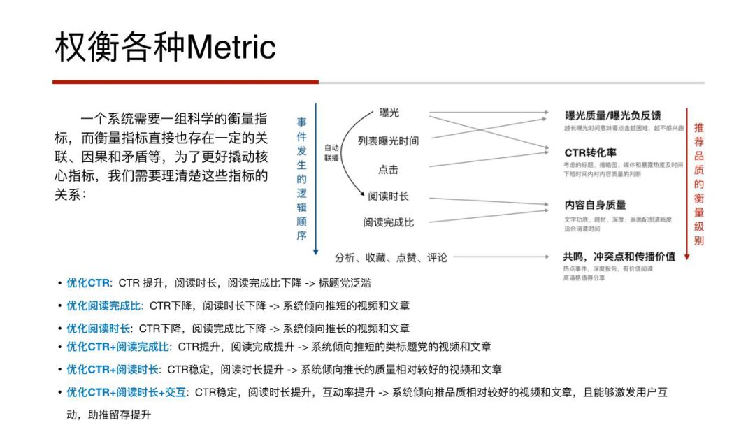 推荐本身就是各种Metric的权衡,对于推荐来说,是非常重要的。因为系统需要科学的衡量指标,但是衡量指标之间往往存在一定的关联、因果和矛盾,为了更好的撬动核心指标,我们需要理清这些指标的关系。