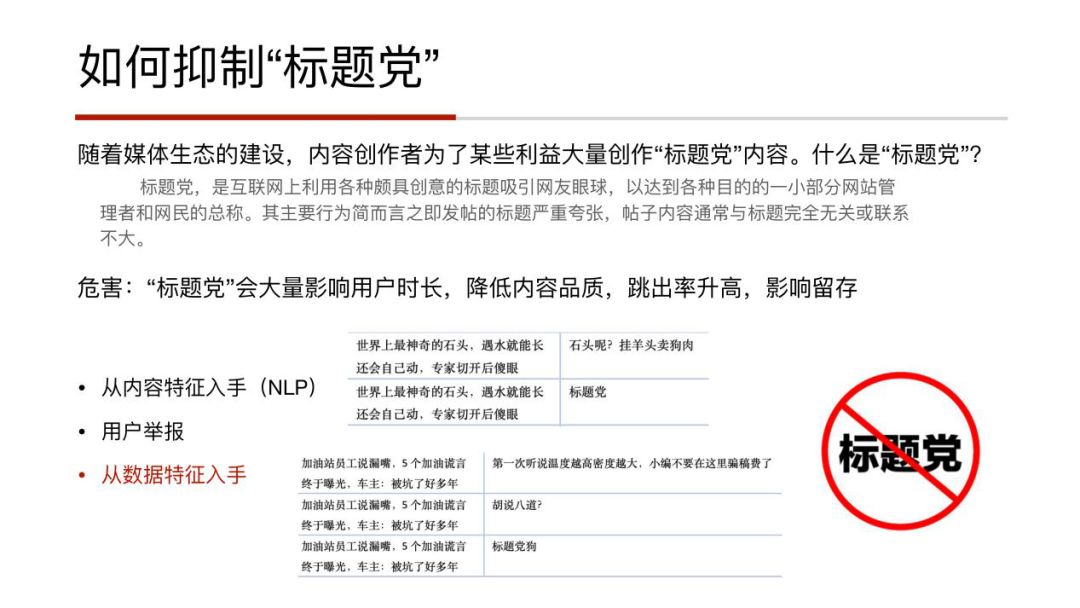 标题党的内容是挺讨厌的,随着媒体生态的建设,内容创作者为了某些利益会写一些与内容不符的标题,吸引用户注意。标题党会严重影响用户的时长,降低内容的品质,还会使得跳出率升高,影响留存。怎么鉴别标题党呢,可以从三个角度出发: