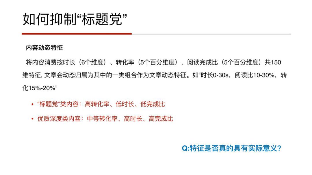 内容质量的判定:怎样判定一个内容质量到底是好还是坏,好的标准到底是什么,以及我们如何去建模,如果可以建模,特征是什么,以及我们的模型如何有效的利用特征去判别,也是一个难题。