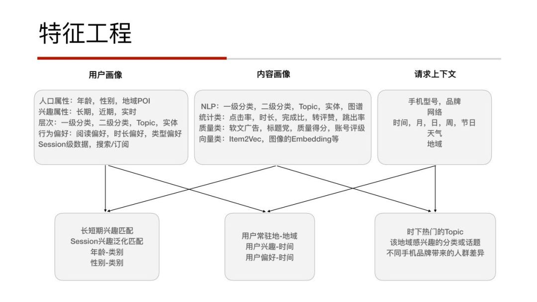 如果拿用户画像与请求的上下文进行特征的交叉,则会得到用户常驻地在什么地方、用户的兴趣随时间的变化,比如有的用户会在早上看新闻,而在晚上看一些娱乐类的资讯;还有一些场景的刻画,如用户喜欢在地铁上看视频,而在办公的时候喜欢看图文。大概能够得到当前时下最热的一些topic是什么,或者手机品牌对于用户的影响,如华为手机的男性用户比偏多,而小米手机年轻人用的比较多等。这些特征的构建对于推荐系统的解释性有很好的支撑,如果没有很强的可解释性,优化的天花板会很低,所以你不知道该往哪个方向进行优化,而这些特征的组合就是为了增加模型的可解释性。