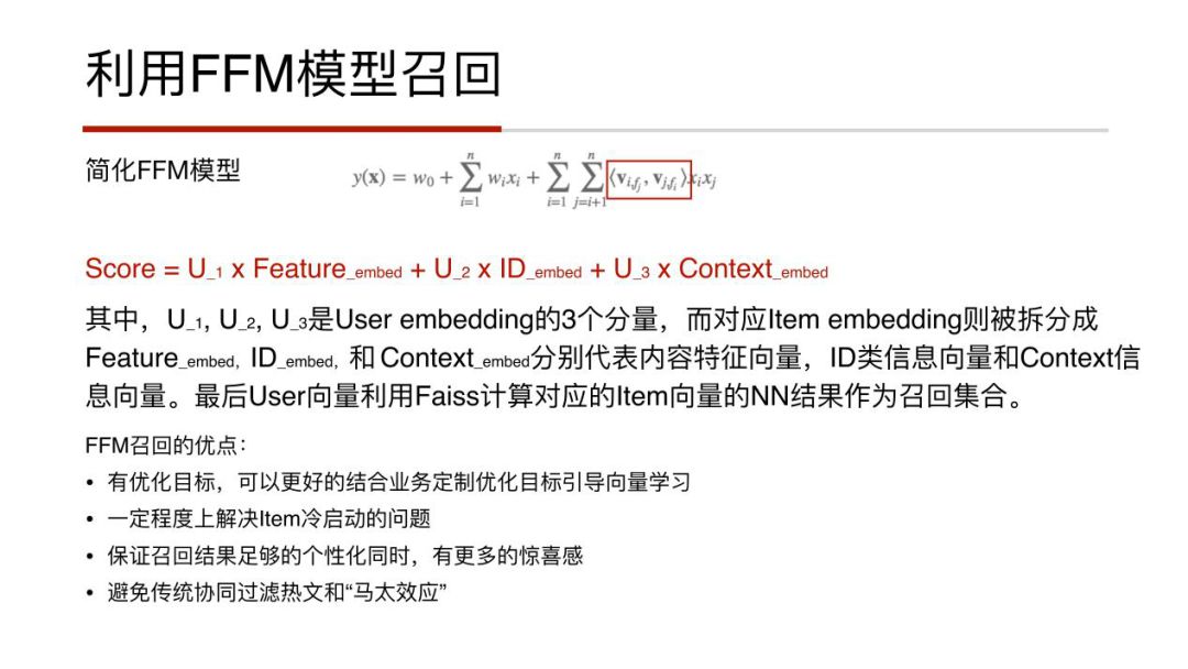 召回部分是一个挺大的话题,我们同样使用了多路召回的方法,这里只介绍利用FFM模型进行召回的方法,我们是使用FM做排序的,而排序是有中间产物的,图中公式的红框中是一些稠密的向量表示,把它们抽出来,就会组合成我们想要的一些稠密表示,比如用户的稠密表示、内容的稠密表示,这也对应着用户的Embedding和Item的Embedding,将User Embedding拆分成三个分量,Item也拆分为三个Feature、ID和Context的特征向量,将他们一一对应并做内积,最后User向量利用Faiss计算对应的Item向量的NN结果作为召回集合,最后可能会做一些后处理,如过滤或者打散等。