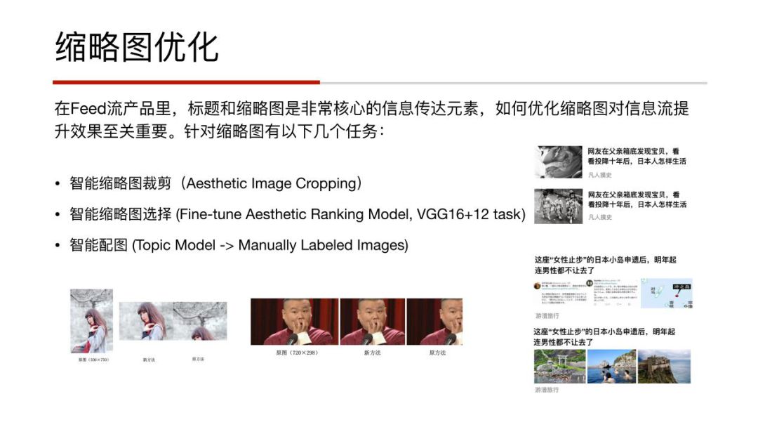 再来看下缩略图的优化,在Feed流产品里,标题和缩略图其实是非常核心的信息传达元素,因为除了标题和缩略图,其它的视觉元素相对的都比较小,所以如何优化缩略图,对信息流的提升效果也是重要的关键。针对缩略图的优化我们也做了很多工作,比如有缩略图的裁剪,传统的裁剪是偏规则的裁剪,会出现一些比较诡异的结果,特别是针对于人脸的裁剪,经常会把头或者脸的一半裁剪掉。我们添加了一个美学的图像裁剪模型做监督并捕捉图像焦点特别是人脸等易错的焦点部分。在图中下半部分,中间的部分就是我们新的模型上线后的效果,会比原来的方法好很多。