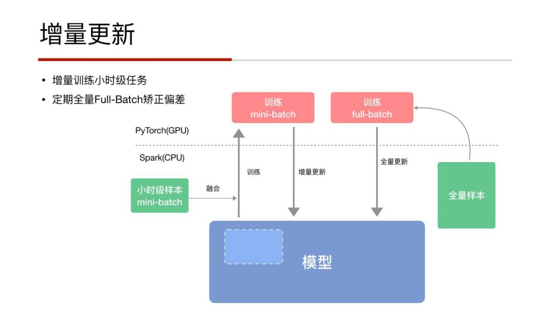在模型更新中,这里主要还是以增量更新为主,在模型设计之初,有两条路向前推进:一个是模型的实时性,一个是特征的实时性。我们面临过这个问题的选择,其实两者代表系统实时性不同的维度,每个方向去提升实时性的话,都意味着会付出大量的代价,有工程的代价,也有系统设计难度的代价。基于自身业务去考虑,我们最终选择了重特征的实时性,轻模型的实时性。在示意图中,左面是小时级的特征,通过训练,增量的对模型进行更新;右面是通过全量样本对模型进行全量的full-batch更新,因为如果一直使用增量模型,时间长了会产生一定的偏差,偏差累积效应会影响线上效果,因此,定期的全量更新是必须的。