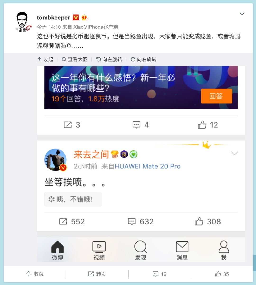想必微博也想「更高级」的改进产品,可惜现在这种压力山大的处境,只能简单粗暴见效快。今天看到一个微博大V的说的挺好,「这也不好说是劣币驱逐良币。但是当鲶鱼出现,大家都只能变成鲶鱼,或者塘虱泥鳅黄鳝肺鱼…… 」