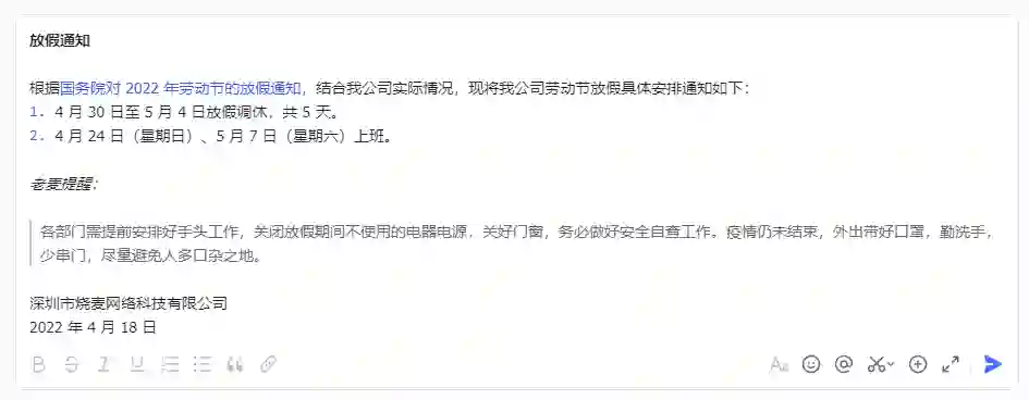 当你需要发布一则文本较多、内容相对正式、不太适合选择语音发布的消息时,不妨点开消息编辑框右侧的格式工具栏。通过格式工具栏我们可以对消息进行适当的排版加工,格式工具栏支持加粗、删除线、斜体、下划线、超链接、引用、有序和无序列表,适当加工就能让发出去的消息更加直观、清爽。