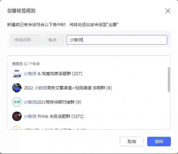 同时标签分组也支持自动规则筛选功能,目前已经支持设置根据特定的会话名称进行添加,希望后续飞书能够在这个功能上带来更多可玩性。