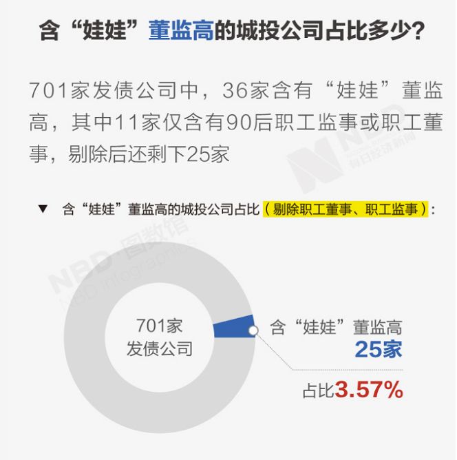 701家发债公司中,36家含有“90后娃娃”董监高,其中11家仅含有90后职工监事或职工董事,90后作为青年职工代表,担任职工董事和职工监事并无异常,剔除职工董事、职工监事后,“娃娃”董监高公司还剩25家,占比3.57%。