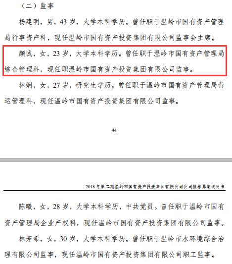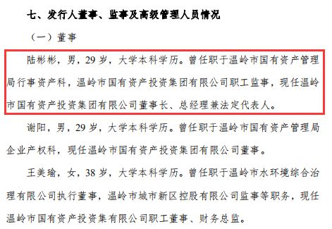 记者注意到,依照此次债券募集说明书披露的信息,在温岭国投集团8名董监高团队中,仅一名职工董事(财务总监为同一人)和监事会主席的年龄超过30岁,其余6名成员均在30岁以内(包括30岁)。