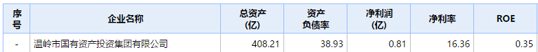 数据显示,截至2017年12月31日,温岭国投集团的资产总计为378.08亿元,负债合计为133.86亿元,所有者权益合计为244.22亿元。2017年度,温岭国投集团实现营业收入11.18亿元,净利润3.41亿元。而根据2018年半年报显示,截至2018年上半年,温岭国投集团的总资产达到408.21亿元;实现营业收入4.96亿元,营业利润为-0.16亿元,净利润0.82亿元。