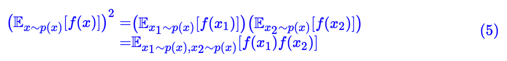 这样一来,每一项都是 f(x1)f(x2)g(x1)g(x2) 的期望,只不过变量的采样分布不一样。