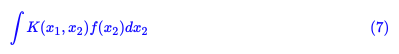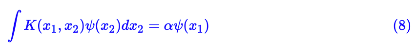就相当于一个矩阵乘以向量的矩阵运算。跟矩阵的特征值和特征向量一样,核函数也能定义特征值和特征函数,满足下述恒等式的一元函数 ψ 就称为这个核函数的特征函数: