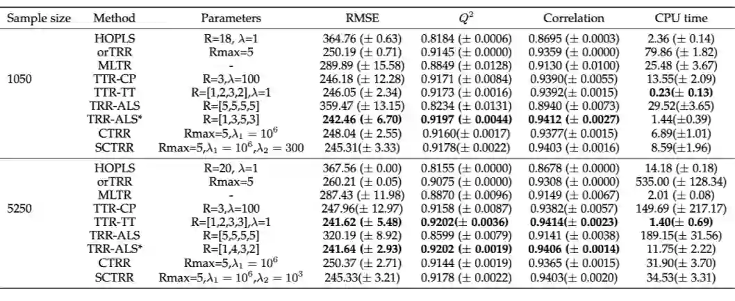 为了克服张量回归中张量环秩估计这一困难,本文提出了一种基于组稀疏约束的紧凑张量回归模型,将张量秩最小化问题放缩为带有组稀疏约束的张量环低秩近似问题。在仿真数据集上的实验验证了 CTRR 可以在训练过程中对回归系数张量的张量环秩进行推断,以获得紧凑的低秩近似。同时,在真实数据集上的实验说明了引入局部平滑约束可以提高模型的预测性能并改善预测的视觉效果。