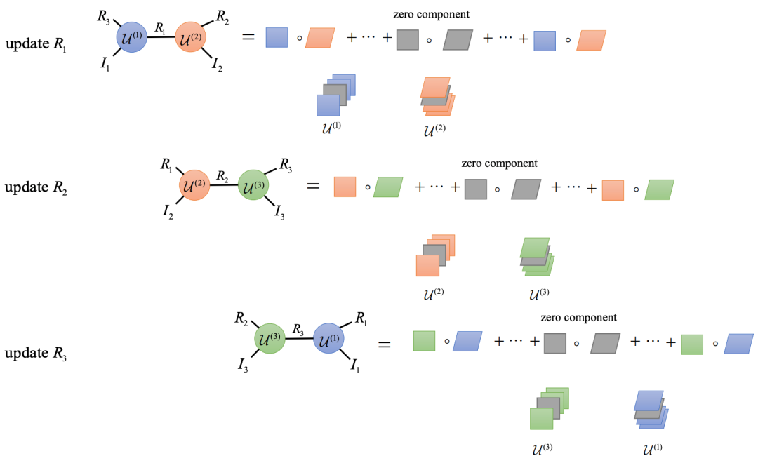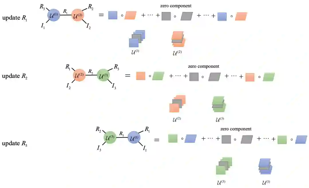 对于给定秩的张量因子化模型,一个最大的挑战便是张量秩的预估。尤其是Tucker 秩,张量链或张量环秩等多线性秩,其预估需要从大量的组合之中进行选取,耗费大量时间。因而,本文以张量环分解为例,引入了一种组稀疏约束项,可以在训练过程中实现对张量环秩的自适应,从而实现模型复杂度和性能的平衡。