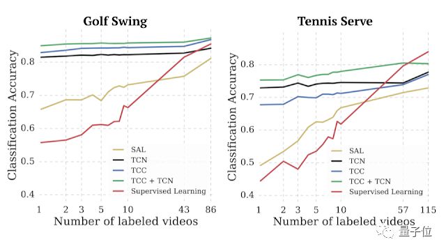 谷歌还将TCC与其它有监督学习算法进行对比。在识别高尔夫挥杆和网球发球这个两个动作时,有监督学习需要50个标记样本才能达到和TCC一样的准确度,而TCC在仅有一个标记样本的情况下就已经有很高准确度了。