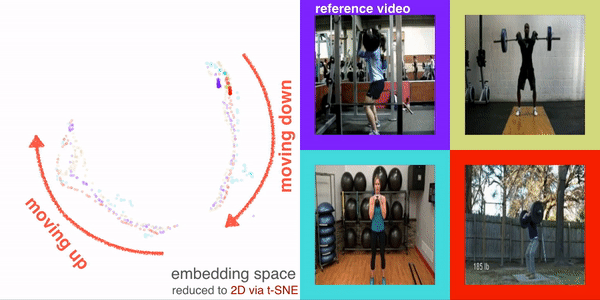 图中左侧的每个点对应于帧嵌入,点的位置随着当前视频帧动作而变化。尽管在姿势、光照、身体等方面存在许多差异,TCC还是能在不提供标注的情况将将两个视频同步起来。