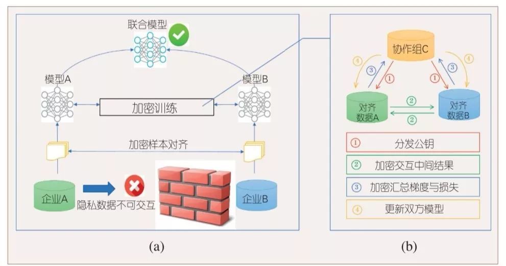 吴海山:第四类是联邦学习,也是目前微众银行在主推的机器学习技术。举个例子,用户去过A医院看病,也去过B医院看病,A医院主要看肝脏病,B医院主要看脑科病,把这些信息综合起来可以让模型训练效果更加准确。这个时候我们采用联邦学习来达到这个效果,不是用数据的共享,数据的传输,而是把模型的参数,包括梯度和损失函数以加密的方式进行传输。我们传输了损失函数和梯度之后就可以更新模型,我们把这种学习叫做联邦学习。