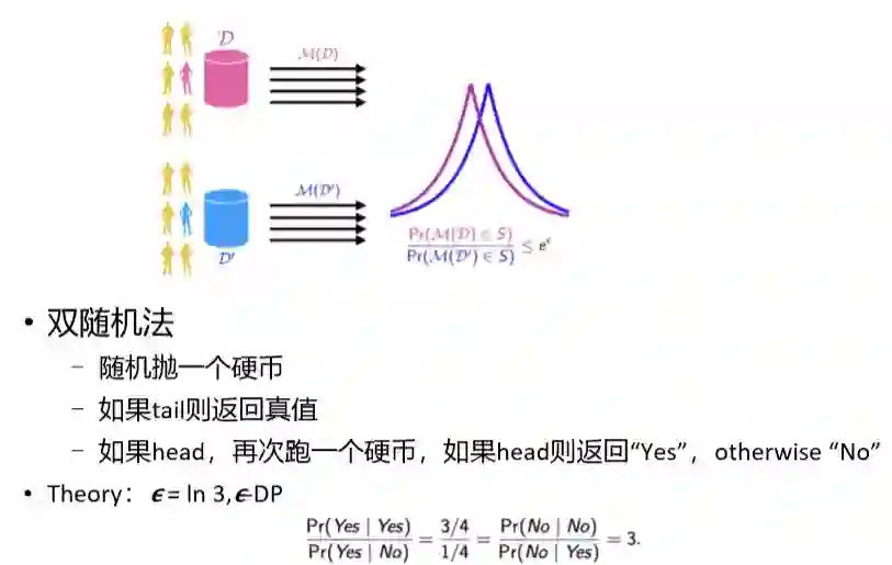 第三类是差分隐私,基本方法就是加噪音,使得根据这一屋子人的数据算出来的模型,和随便把某个人踢出去算出来的模型是一样的,这时候某个人隐私就得到保护。