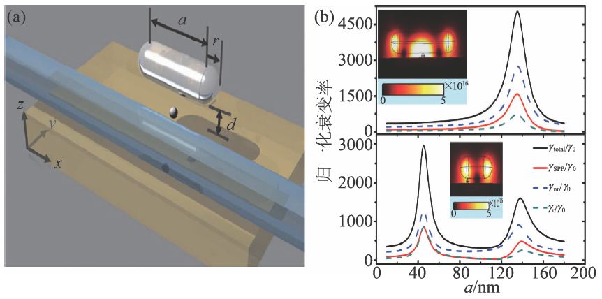 在表面等离激元结构中,金属纳米颗粒可以支持亚波长尺度的局域模式,存在着巨大的近场增益或电磁场“热点”,但是却很难收集产生的单光子[21—23];而束缚在金属和介质界面的倏逝波,是传播的模式,它虽然可以传导光子,但是珀塞尔系数又相对较低[36, 50]。为了克服这些困难,我们提出了既能高效产生又能高效收集的间隙表面等离激元结构[30, 51—53]。不同于传统的腔模,在这种复合结构中,因为表面等离激元模式存在损耗并且具有开放性,单量子体系的自发辐射一般可分为三个通道:与传播表面等离激元耦合的表面等离激元通道(速率为γSPP ),远场辐射通道(速率为γr ),以及由于金属损耗导致的非辐射通道(速率为γnr )。量子体系总的自发辐射速率为三者之和,即γtotal = γSPP + γr + γnr[30,51—53]。