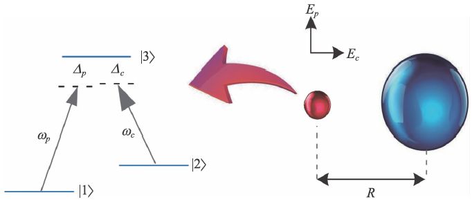 图7 具有Λ 型三能级结构的量子发射体和金属小球的杂化体系,用两束入射光驱动整个体系[59]