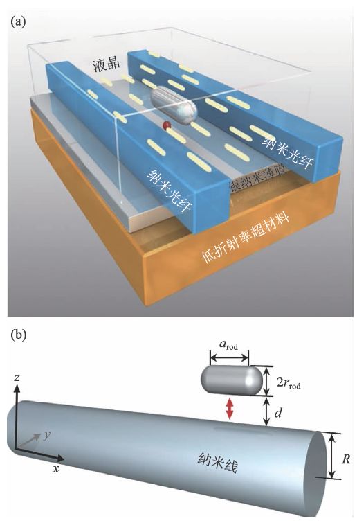 光子结构一旦被制备出来,自发辐射的性质将不能被改变。为了实现主动调控,我们将折射率随光轴变化的液晶材料引入到表面等离激元结构中。先是在液晶—金属—低折射率超材料的三明治平板结构中,通过外加方式调节液晶的光轴,从而得到主动调控的表面等离激元模式,可以实现2.5 倍的珀塞尔系数调控范围[51]。然后,我们又加入了金属纳米棒到这个结构中,设计了可调谐的间隙表面等离激元模式(图4(a)),使得“热点”处的量子发射体的珀塞尔系数从103变化到8750,开关比达到了85,实现了单个量子体系的自发辐射开关[52],利用液晶材料的超快响应特性,可以在10 ns 之内,完成10 倍对比度的开关效应。进一步地,我们还设计了对称的方形介质波导光纤,使光子的收集效率超过了40%[52]。另外,我们还提出了使用纳米线上的倏逝波模式来形成间隙表面等离激元并完成一维的光子收集和传输[53],如图4(b)所示。在复合的银纳米线和银纳米棒结构中,珀塞尔系数可以达到14208,其中沿银纳米线传播的部分可达39.3%,辐射光子在纳米线中的传播距离大于25 μm。如果将银纳米线换成介质纳米线,珀塞尔系数可达3142 并且53%的辐射光子可以通过介质纳米线进行低损耗的传输。这些结构以及新的增大珀塞尔效应的机制,结合了大的自发辐射增强、可调谐、有效的纳米尺度的光子收集和传输等优点,将会对芯片上的超亮单光子源和纳米激光有重要影响。