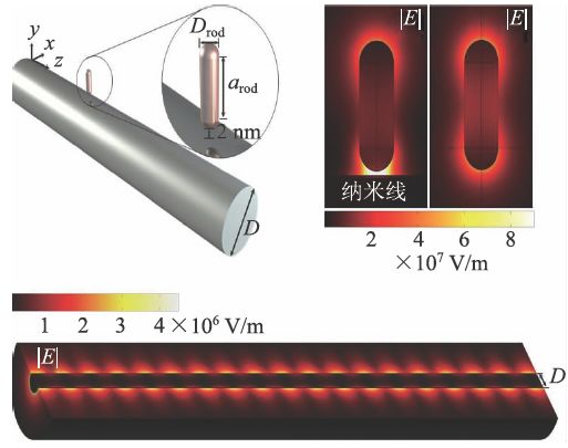 我们首先提出了一种纳米尺度上的腔量子电动力学系统,包含量子体系和共振的银纳米腔,整个系统处于一维金属纳米线或介质纳米线的倏逝波环境中[67],如图5 所示。通过精心的模式设计,相比于自由电磁真空背景,在倏逝电磁真空的作用下纳米间隙中的元激发电场值E 将大大增加,从而增强银纳米腔和量子体系的耦合因子g。在银纳米线提供倏逝电磁真空背景中,g 因子可以达到4.2 倍的增强,同时量子体系的荧光光谱上出现了拉比劈裂。同时,通过金属或者介质纳米线上的倏逝波模式收集荧光光子,收集率可达12%—47%。进一步地,我们又将这个系统放在由金属薄膜所支撑的二维倏逝真空环境中[68]。通过增加倏逝深度,间隙表面等离激元的“热点”强度进一步增强,随之量子体系和光子的耦合系数也会极大增加。另外,通过改变金属纳米微腔的大小、微腔和银板之间的距离以及将金属纳米棒换成锥型或者双锥型,耦合系数会进一步提高。最后,为了减少金属纳腔的固有损耗,在低损耗情况下得到强耦合,我们将回音壁模式和倏逝波模式结合,设计了一种介质纳米圆环—纳米线的复合结构[32]。在介质微米圆环和介质纳米线的几纳米间隙中,耦合系数g 增强了数倍,而腔损耗κ 和原子损耗γ 小于g,达到了强耦合。