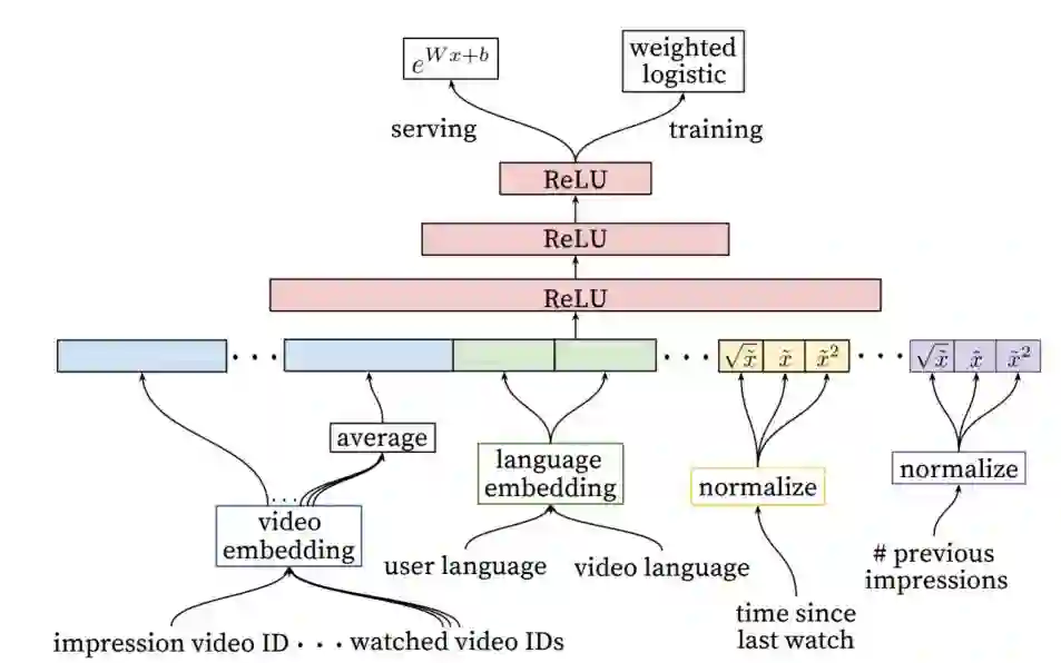 YouTube用来预测用户观看视频时长,转化为加权的逻辑回归问题。DNN排序模型和前面的工作类似,其网络结构是标准的前馈神经网络,如图20所示。DNN排序模型的特点还是在输入特征上。虽然深度学习模型对特征工程要求很低,但很多数据需要经过简单处理后才可加入模型。图20中的特征分为很多域,比如语言方面、视频方面、用户历史看过的视频ID,还有之前观看时长的统计量和归一化的值。离散值经过Embedding的处理后变成连续向量,再级联起来经过多层非线性变化后来预测最终的标签。