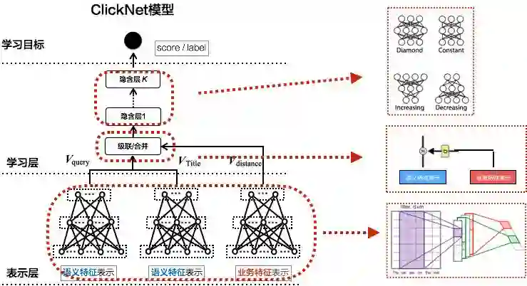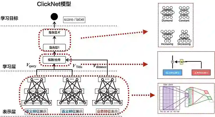 ClickNet设计的初衷是它作为文本的匹配模型,并作为一维语义特征加入到业务的Rank模型中以提升效果。但根据上线之后的数据分析,我们发现以语义特征表示为主、辅以部分业务特征的ClickNet在排序系统中有更好的表现。我们针对排序模型做了如下改进。