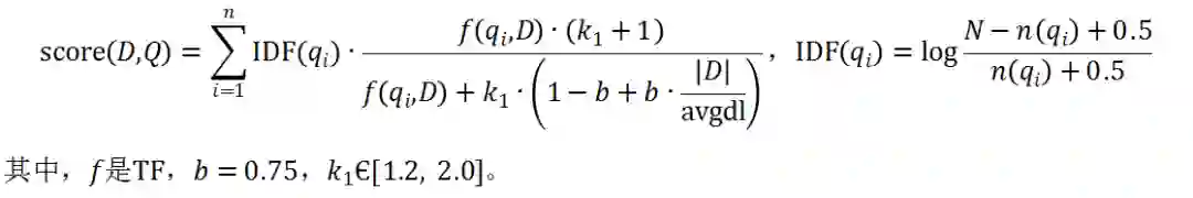 向量空间模型用高维稀疏向量来表示文档,简单明了。对应维度使用TF-IDF计算,从信息论角度包含了词和文档的点互信息熵,以及文档的信息编码长度。文档有了向量表示,那么如何计算相似度?度量的公式有Jaccard、Cosine、Euclidean distance、BM25等,其中BM25是衡量文档匹配相似度非常经典的方法,公式如下:
