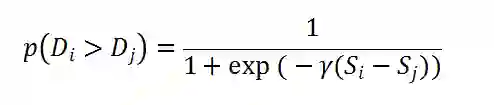 RankNet是Pairwise的模型,同样转化为Pointwise来处理。比如一次查询里,Di和Dj有偏序关系,前者比后者更相关,那把两者的特征作为神经网络的输入,经过一层非线性变化后,接入Loss来学习目标。如果Di比Dj更相关,那么预测的概率为下式,其中Si和Sj是对应Doc的得分。
