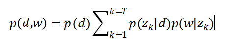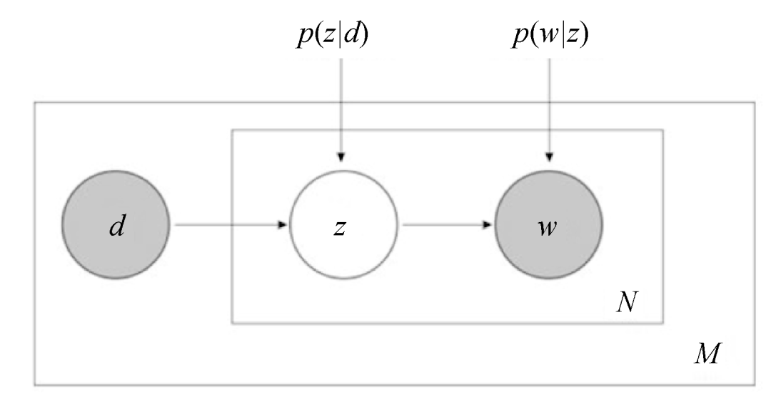 假设每篇文章都由若干主题构成,每个主题的概率是p(z|d),在给定主题的条件下,每个词都以一定的概率p(w|z)产生。这样,文档和词的共现可以用一种产生式的方式来描述: