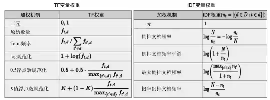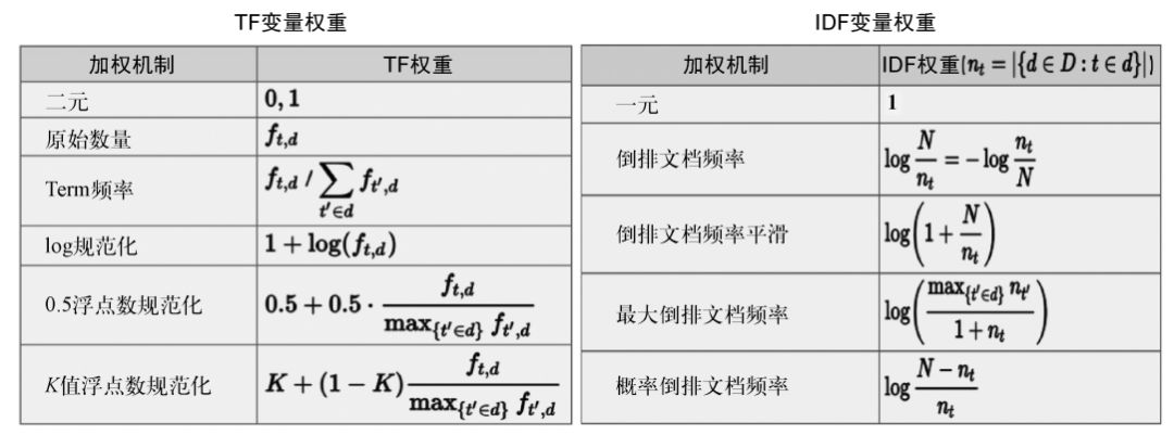 对文本“丽江的酒店价格”分词去除停用词后,得到丽江、酒店、价格,词出现次数是1,查表IDF得到这句文本的表示:[0, 1.5, 2.1, 0, 0, …, 0, 4.1]。其中权重使用的是TF×IDF,TF是Term在文本里的频次,IDF是逆文档频次,两者定义有很多形式,如图4所示。这里使用第二种定义。