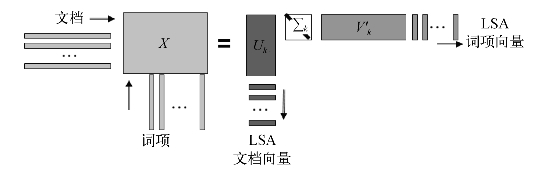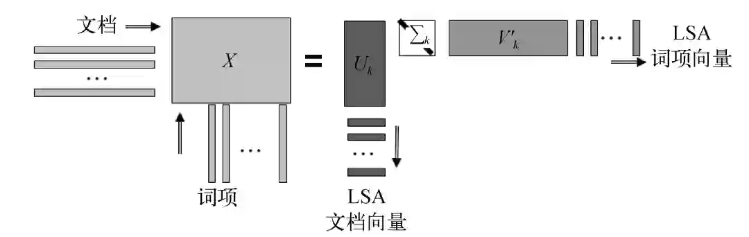 向量空间模型的高维度对语义信息刻画不好,文档集合会表示成高维稀疏大矩阵。1990年左右,有人研究通过矩阵分解的方法,把高维稀疏矩阵分解成两个狭长小矩阵,而这两个低维矩阵包含了语义信息,这个过程即潜在语义分析。