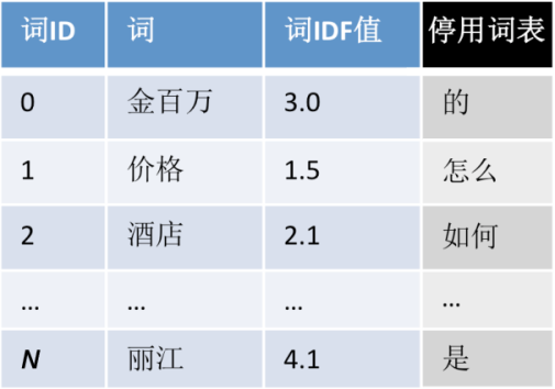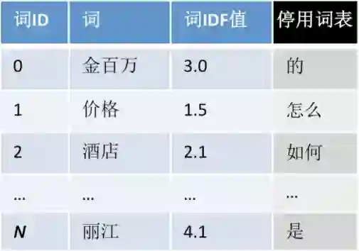 1970年左右提出的向量空间模型,就是把文档表示词表维度的向量通过TF-IDF计算出词的权重,比如一种标准词表包含词ID、词和IDF,另一种是停用词表,如图3所示。