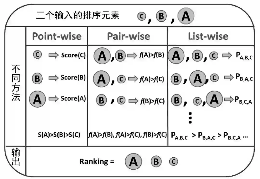 排序模型主要分类三类:Pointwise、Pairwise、Listwise,如图17所示。Pointwise对单样本做分类或者回归,即预测
