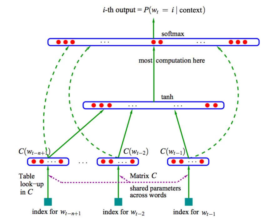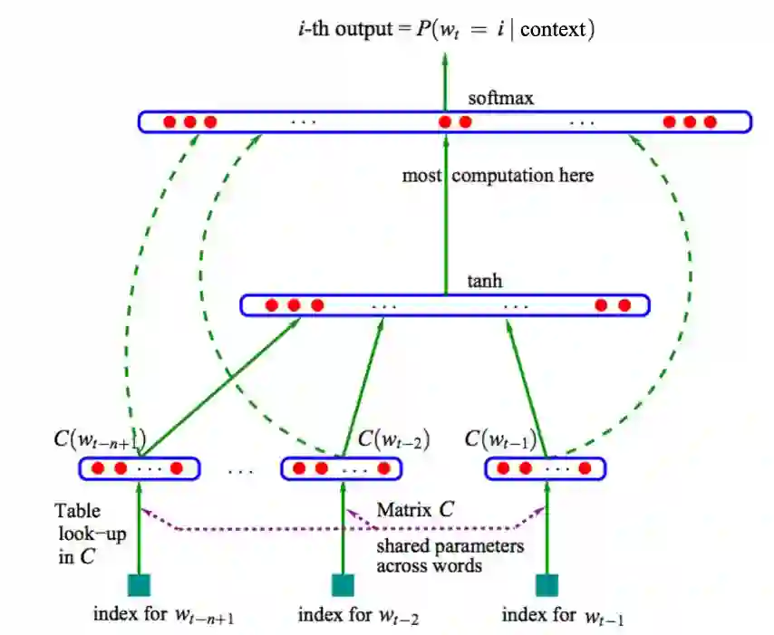 2013年,Tomas Mikolov发表了Word2Vec相关的论文,提出的两个模型CBOW(Continuous Bag of Words,连续词袋)和Skip-Gram能极快地训练出词嵌入,并且能对词向量加减运算,这得到了广泛关注。在这项工作之前,神经网络模型经历了很长的演进历程。这里先介绍2003年Yoshua Bengio使用神经网络做语言模型的工作,Word2Vec也是众多改进之一。