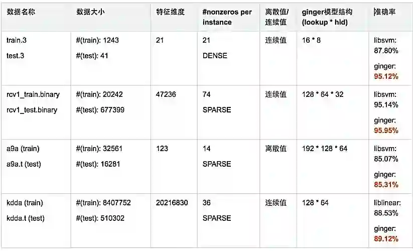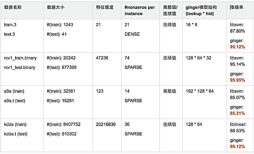ClickNet是基于自研的深度学习框架Ginger实现的,收敛速度和效果都非常理想。我们来看看分类任务上的一些测试,如图22所示。在Higgs数据上,基于Ginger的ClickNet比基于XGBoost的AUC提升34个千分点,使用TensorFlow实现的ClickNet比基于Ginger的AUC差3个千分点,且其速度慢于Ginger。如图23所示,ClickNet相比线性模型,其准确率都有较好的提升。