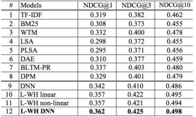 使用搜索的点击数据训练语义模型,输入查询Query(Q)和展现点击的Doc(D)列表,先对Q和D做语义表示,再通过Q-DK的Cosine计算相似度,通过Softmax来区分点击与否。其中,语义表示先使用词散列对词表做降维(比如英文字母的Ngram),经过几层全连接和非线性变化后得到128维的Q和D的表示。从实验结论可知,NDCG指标提升还是很明显的,如图12所示。