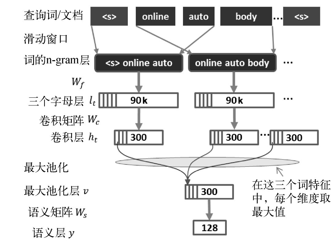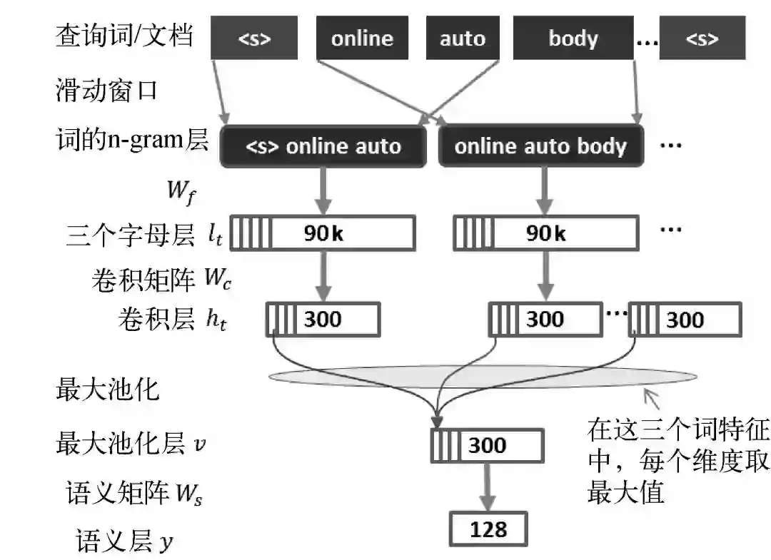 在DSSM基础上,CLSM增加了1维卷积和池化操作来获取句子全局信息,如图13所示。通过引入卷积操作,可以充分考虑窗口内上下文的影响,从而保证词在不同语境下的个性化语义。