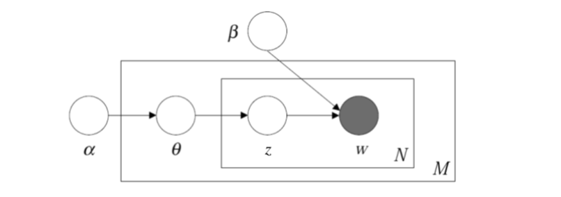 和pLSA概率图模型不太一样,LDA概率图模型引入了两个随机变量α和β,它们就是控制参数分布的分布,即文档-主题符合多项式分布。这个多项式分布的产生受Dirichlet先验分布控制,可以使用变分期望最大化(Variational EM)和吉布斯采样(Gibbs Sampling)来推导参数,这里不展开叙述。