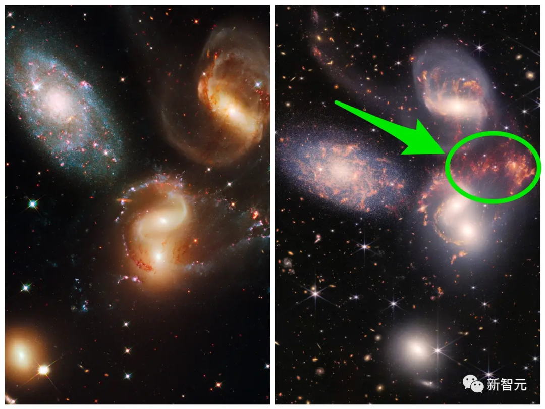 对比哈勃望远镜,我们可以在韦伯望远镜拍摄的图像中,看到全新的细节——星系合并时产生的恒星托儿所。