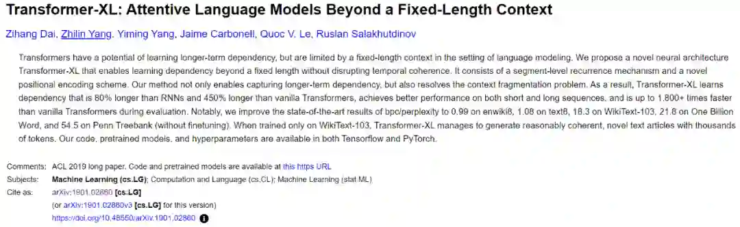 然而Transformer-XL 在投稿 ICLR 2019 时被拒稿,之后作者基于 Transformer-XL 进行改进,提出了 XLNet,被 NeurIPS 2019 接收。而 Transformer-XL 则被 ACL 2019 接收。