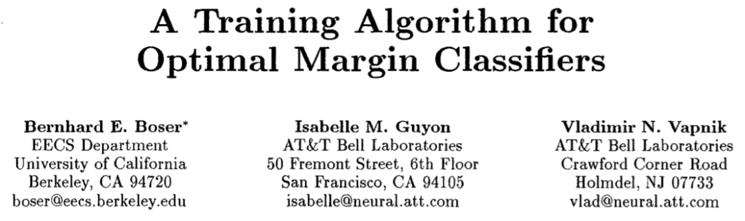 1992 年,Bernhard E. Boser 、 Isabelle Guyon 以及 Vladimir Vapnik 合作写了一篇论文《A Training Algorithm for Optimal Margin Classifiers》,文中解释了如何获得这个函数以便它在干净的数据上工作。