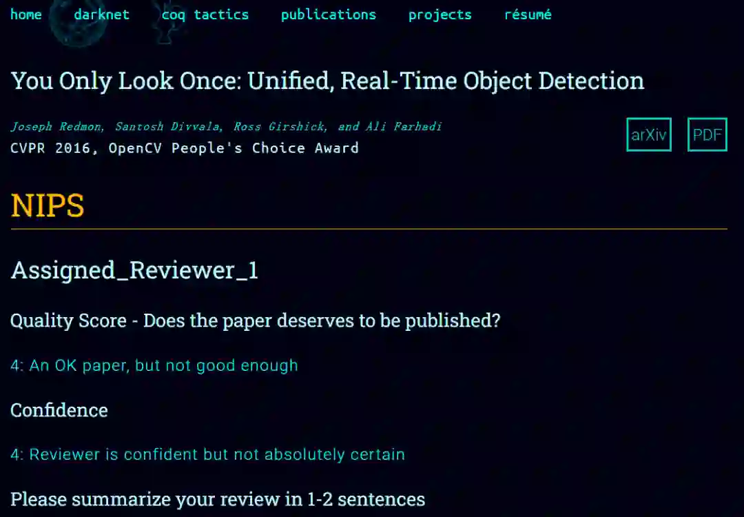 大名鼎鼎的 YOLO 算法,作为计算机视觉领域最知名的目标检测算法之一,在投稿 NIPS 时也不是一帆风顺。NIPS 给出的评价大体为:这是一篇不错的论文,但还不够好。之后 YOLO 这篇文章被 CVPR 2016 接收。有了这次教训,YOLO2 也是第一时间投稿 CVPR。