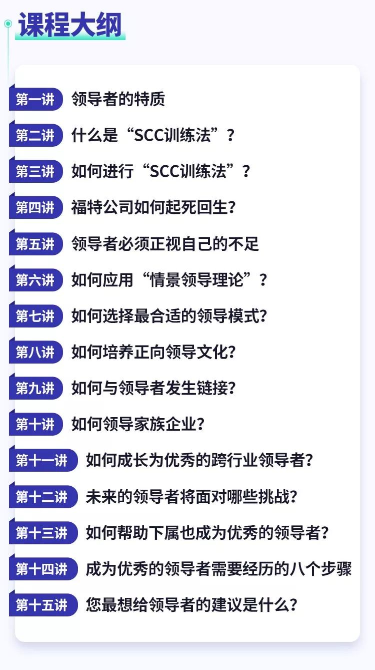 课程分为领导者的自我成长之旅、领导者如何轻松影响他人和领导者如何突破困境三个部分,对自我认识、与人相处、学习和指导、转折与选择、应对挫折等管理要素都提供了较为详细的大师级指导。
