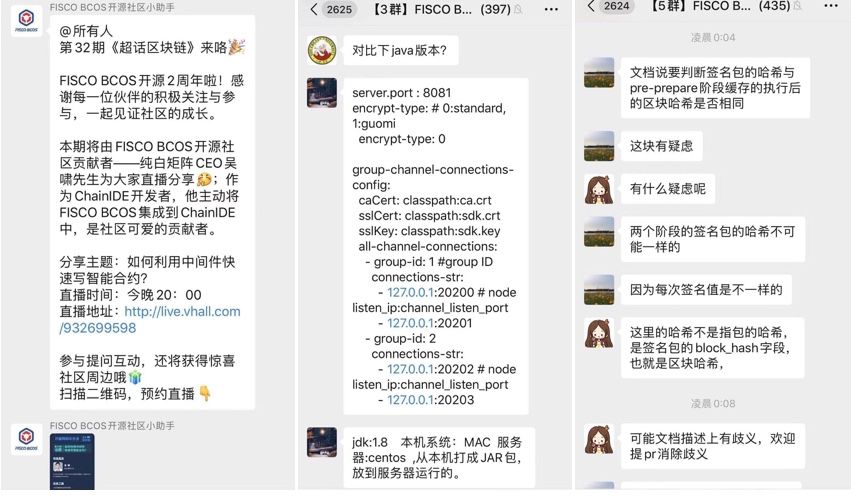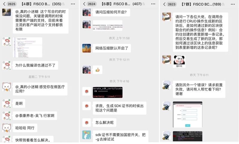 FISCO BCOS作为较早拥抱开源的联盟链底层平台,以开源连接起上万名个人开发者和超过500家企业及机构,拥有最大最活跃的国产开源联盟链生态圈,其技术群每天都有大量的技术讨论,甚至直接在群里飚代码;即使在凌晨询问,也能得到瞬间回复。此外,FISCO BCOS还在每周四在群里定期开展区块链小课堂,由技术大牛和资深社区成员进行话题分享。日常画风如下:
