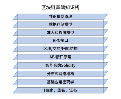 掌握了区块链的基础知识以后,你还需要对区块链平台的基本结构有所了解。张开翔为区块链入门开发者绘制了一个实用型技能树,他认为,区块链领域的基础知识栈从底层到上层依次由以下几个部分构成: